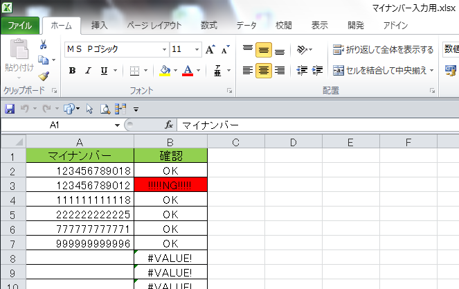 =IF(IF(MOD(MID(A1,1,1)*6+MID(A1,2,1)*5+MID(A1,3,1)*4+MID(A1,4,1)*3+MID(A1,5,1)*2+MID(A1,6,1)*7+MID(A1,7,1)*6+MID(A1,8,1)*5+MID(A1,9,1)*4+MID(A1,10,1)*3+MID(A1,11,1)*2,11)<1,0,11-MOD(MID(A1,1,1)*6+MID(A1,2,1)*5+MID(A1,3,1)*4+MID(A1,4,1)*3+MID(A1,5,1)*2+MID(A1,6,1)*7+MID(A1,7,1)*6+MID(A1,8,1)*5+MID(A1,9,1)*4+MID(A1,10,1)*3+MID(A1,11,1)*2,11))=INT(MID(A1,12,1)),"OK","!!!!!NG!!!!!")
