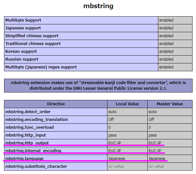- まずはphpinfo()で「mbstring」を確認してみる。特に以下の項目。